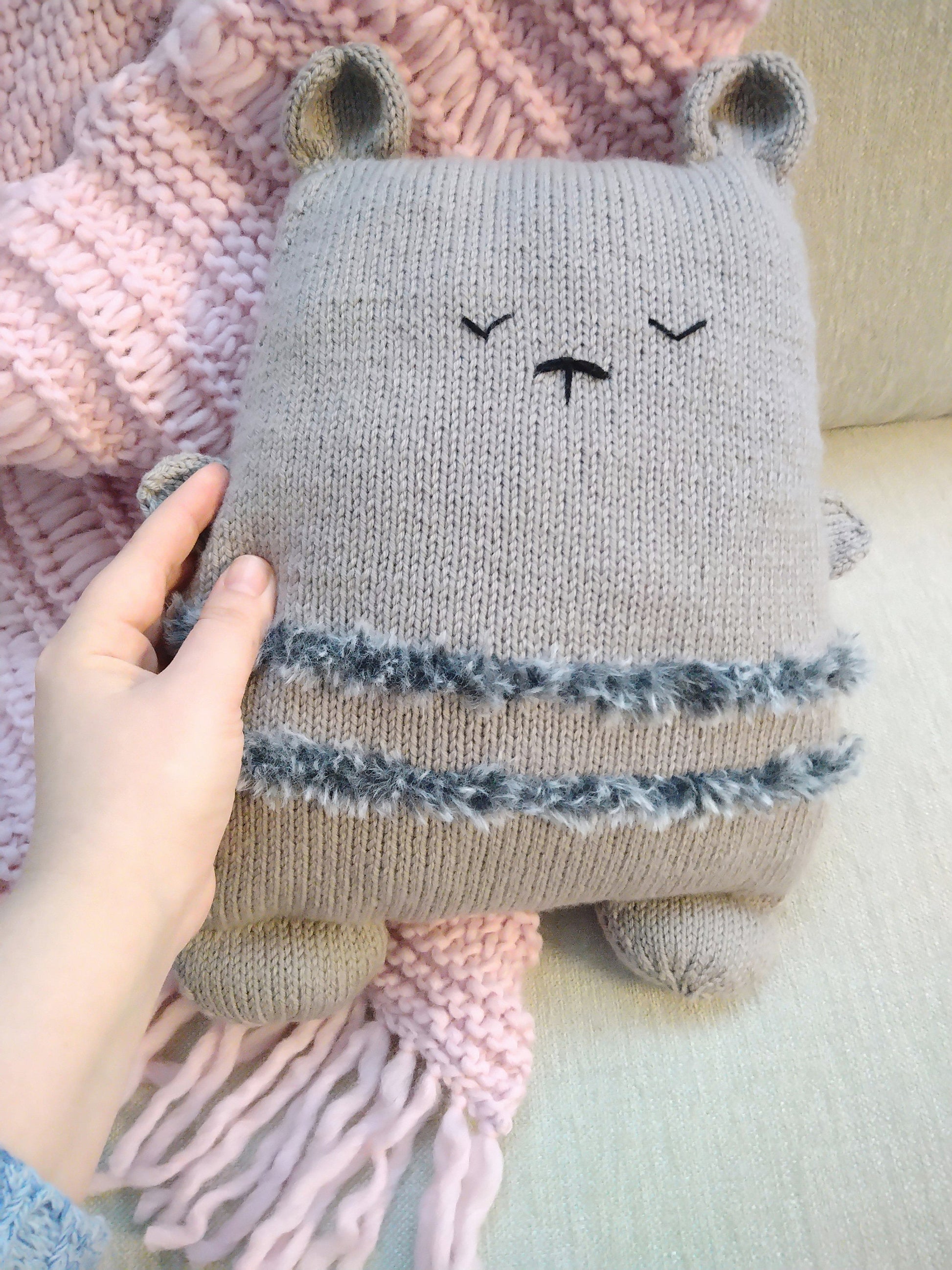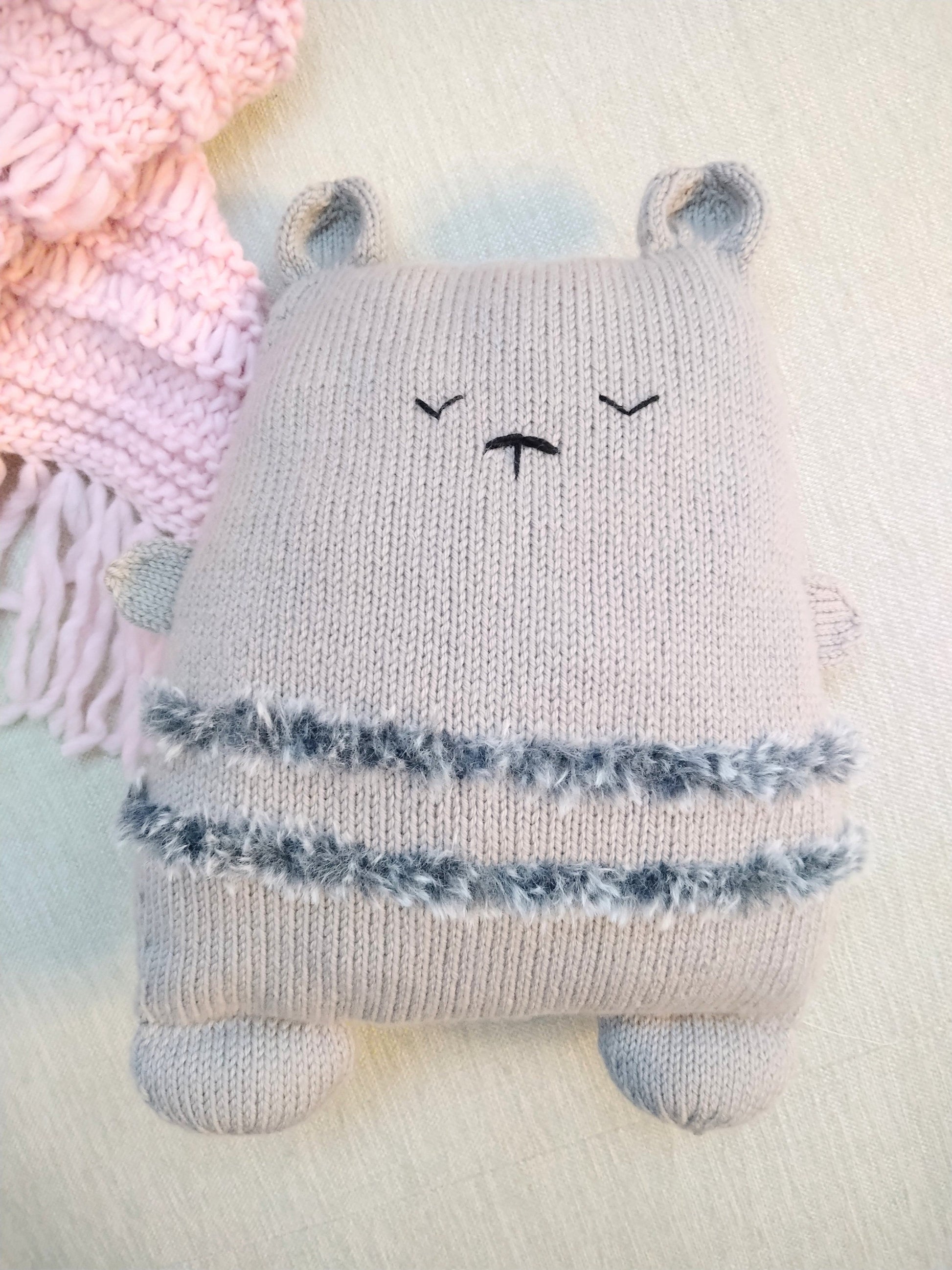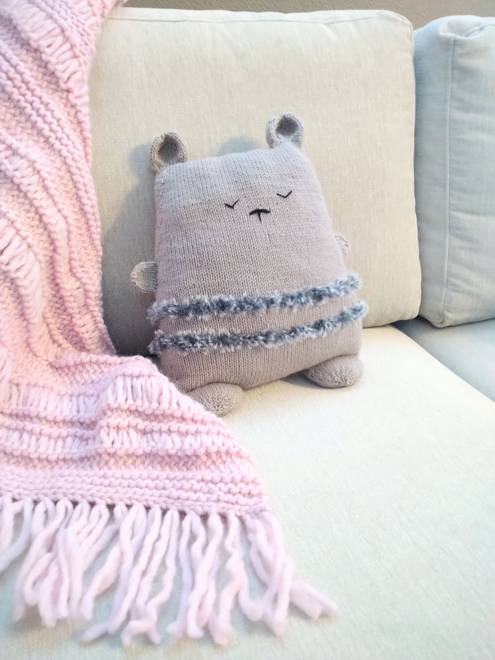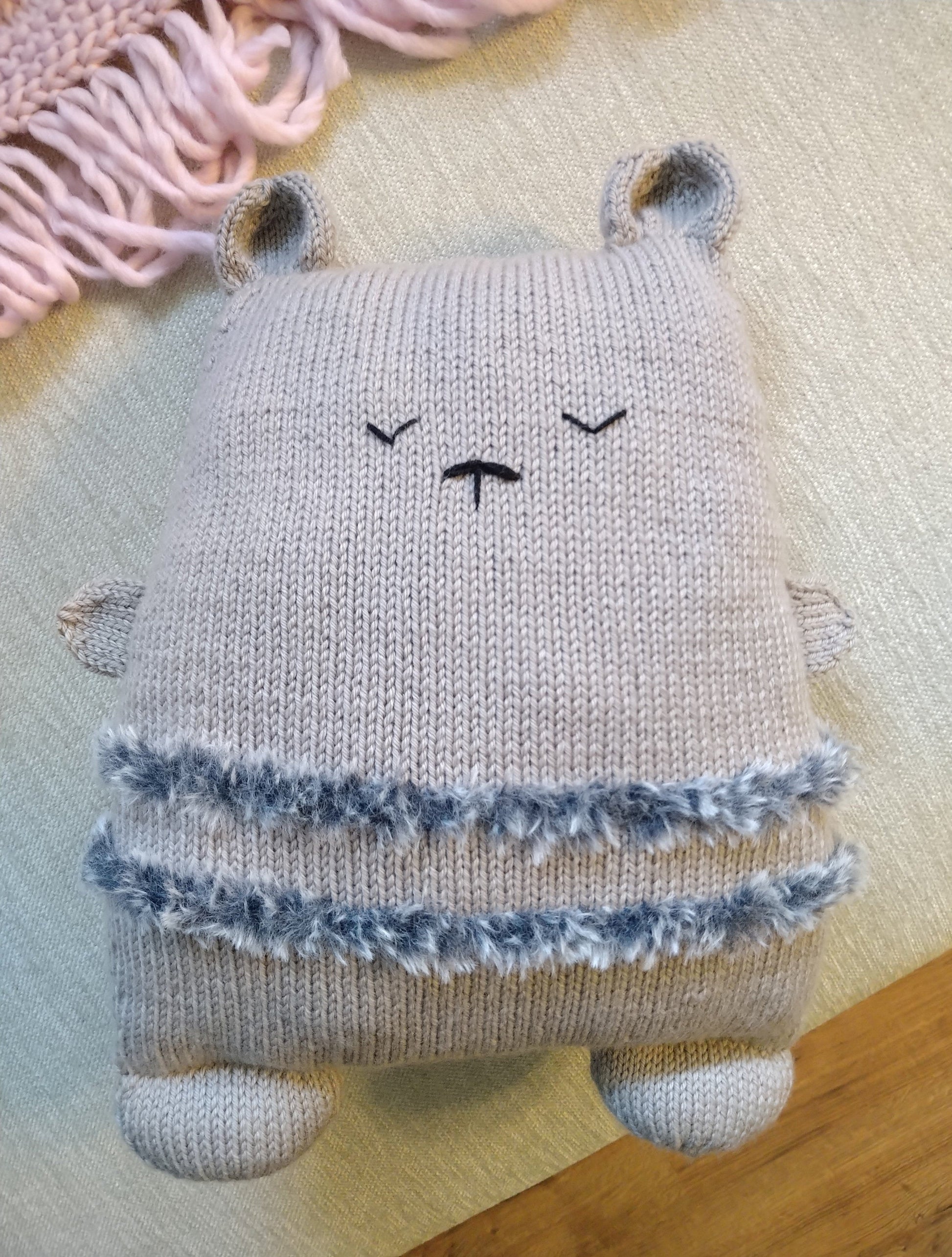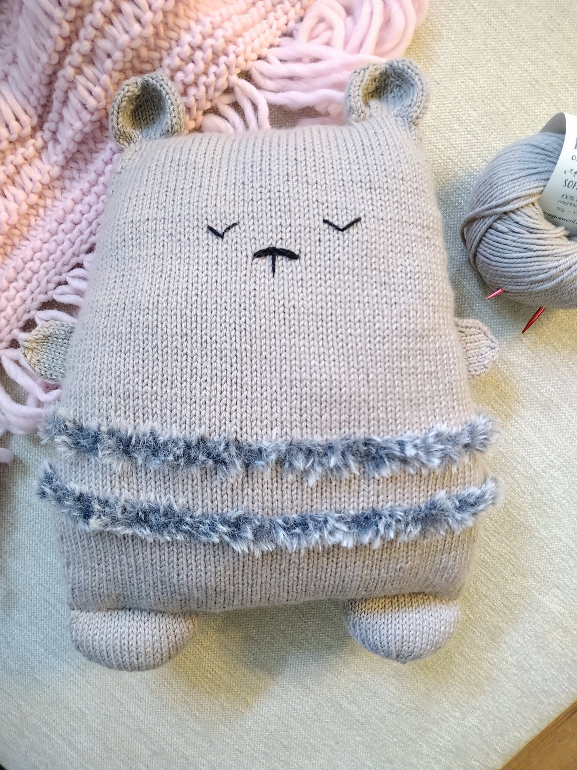 Material: 100% merino ull (Imagine), polyester dekoration på björnens mage (Fur Lux från Go Handmade), stoppad med hollofiber.